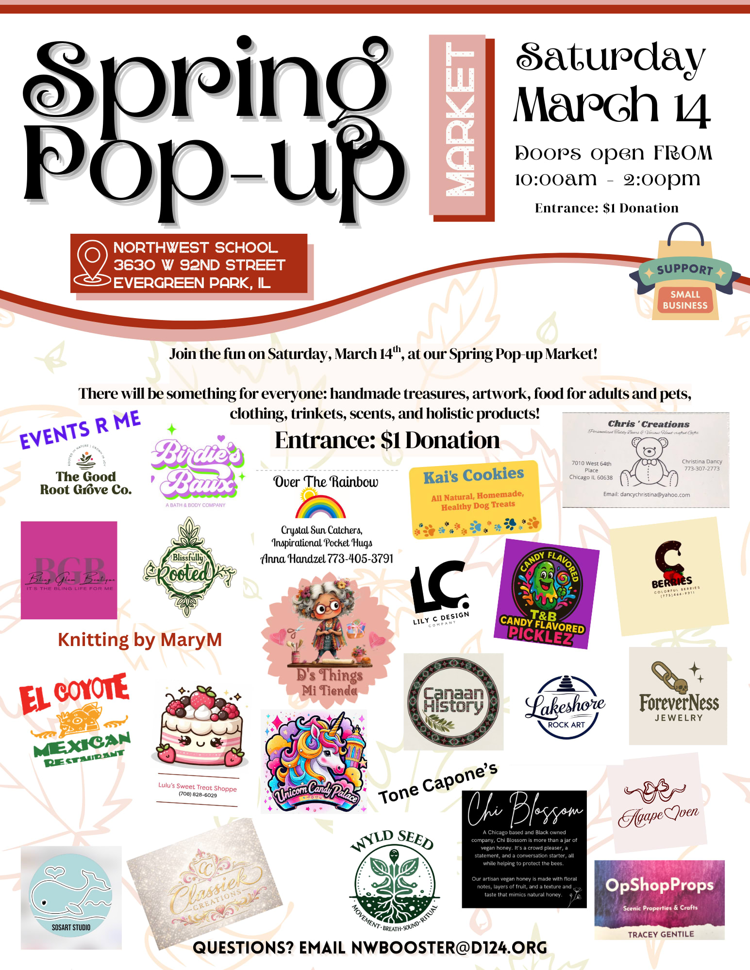 Join the fun on Saturday, March 14, at the Spring Pop-up Market! There will be something for everyone: handmade treasures, artwork, food for adults and pets, clothing, trinkets, scents, and holistic products.