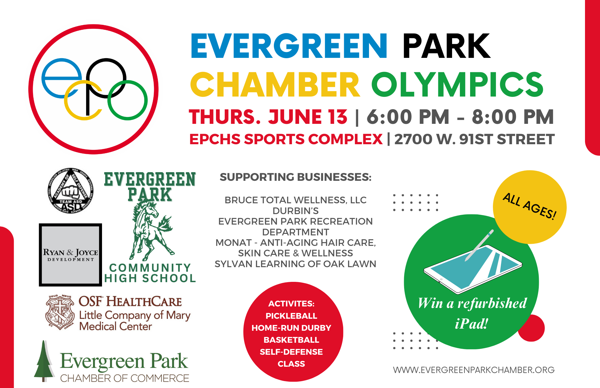 The Evergreen Park Chamber of Commerce is proud to announce that the Chamber Olympics is returning to Evergreen Park on Thursday, June 13, 2024, from 6:00 p.m. - 8:00 p.m. at the Evergreen Park Community High School Sports Complex to showcase this gem of a facility in the heart of our community, while also highlighting the many fitness, health, and wellness related organizations in the Village -- and to get the community moving!!