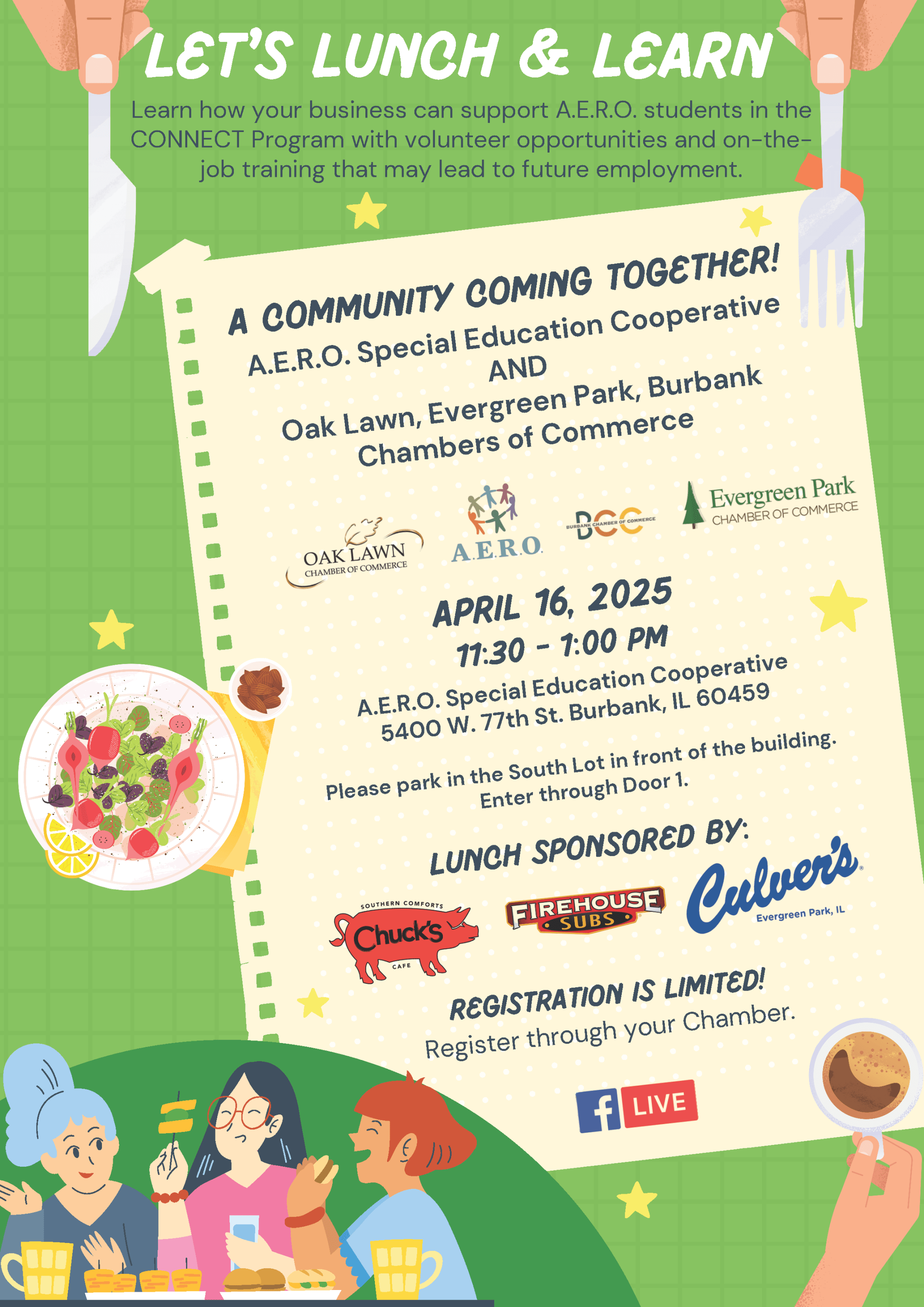 Join the Evergreen Park, Oak Lawn, and Burbank Chambers of Commerce for a Lunch & Learn in partnership with A.E.R.O. Special Education Cooperative on Wednesday, April 16, 2025, from 11:30 a.m. to 1:00 p.m. at A.E.R.O.’s Burbank office (5400 W. 77th Street, Burbank, IL 60459).