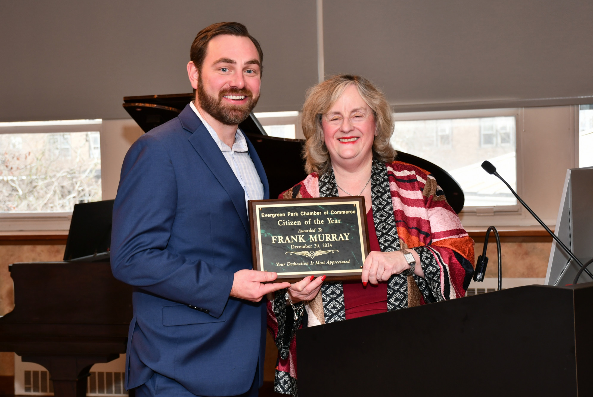 “Frank exemplifies the spirit of community service and leadership that makes Evergreen Park special,” said Laura Shallow, 1st Vice President of the Evergreen Park Chamber of Commerce, as she presented the award. “His tireless efforts have left a lasting impact, and we are proud to honor him today.”
